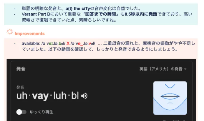 毎週の音読課題は経験豊富な日本人コーチがフィードバックを行います。日本人が間違えがちなng/ŋ/の発音エラーも見逃さず、的確に日本語でフィードバックをするため、発音技能・知識が伸びます。