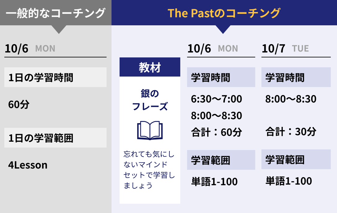 一般的な英語コーチングは、英語力向上を目指すカリキュラムを作り、週ごとの面談や日々の学習管理で自主学習をサポートします。これに対し、The Pastの習慣化コーチングでは「習慣化の仕組みづくり」を徹底している点が大きく異なります。